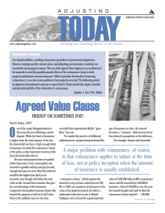 A D J U S T I N G P r o v i d i ng Lo s s Con s u l t i ng S e r v i c e s t o t he I n s u r e d www.adjustingtoday.com AdjustersInternational FRIEND? OR SOMETIMES FOE? Agreed Value Clause Paul O. Dudey, CPCU One of the major disappointments a firmmay discover following a severe disaster: While the limit of insurance is higher than the total amount of the loss, the insured did not have a high enough limit of insurance to satisfy the coinsurance clause of the policy, so that insurance recovery of the loss is dramatically reduced. Because most property losses are partial rather than total, it was commonplace for insureds to gamble and buy and pay for only enough insurance to cover what they believed would be the highest loss likely to be incurred, even though well below the total value at risk. In most loss scenarios, this gave the cost advantage to that insured as compared to the prudent insurance buyer who insured the property at risk for its full value. Only in the unlikely case of a loss that exceeded their expectations did the “gamblers” lose out. To combat this practice of deliberate underinsurance, property insurers devised the “coinsurance clause,” which requires the insured to carry at least a stated percent (80, 90, or 100% are common) of insurance to the value of the property insured, for which a substantial reduction in rate is offered. Failing to carry at least the required percentEDITOR’S NOTE age of insurance to value, the insured becomes a “coinsurer,” with recovery of any loss reduced in proportion to the deficiency. For example: Assume total insurable value of $100,000 with an 80% coinsurance clause and the insured buys $40,000 of insurance. A loss of $30,000 occurs. Because the insured bought only half of what the coinsurance clause required—$40,000, For all policyholders, avoiding coinsurance penalties is of paramount importance. However, keeping up with current values, and adjusting your insurance routinely can overwhelmmost property owners. The use of the Agreed Value Option is an excellent tool for insureds to avoid the possible penalty effects of the coinsurance clause in both property and business income insurance. While it provides the benefit of removing coinsurance, it can also create problems if not properly exercised. The following article by Adjusters International’s insurance expert Paul O. Dudey details the origins, benefits and potential pitfalls of this alternative to coinsurance. Stephen J. Van Pelt, Editor A major problem with coinsurance, of course, is that coinsurance applies to values at the time of loss, not at policy inception when the amount of insurance is usually established. (continued on next page)