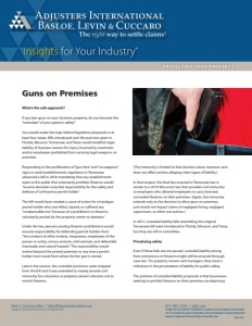 PROTECTING YOUR PROPERTY ® What’s the safe approach? If you ban guns on your business property, do you become the “custodian” of your patrons’ safety? You would under the logic behind legislative proposals in at least four states. Bills introduced over the past two years in Florida, Missouri, Tennessee, and Texas would establish legal liability of business owners for injury incurred by customers and/or employees prohibited from carrying legal weapons on premises. Responding to the proliferation of “gun-free” and “no weapons” signs in retail establishments, legislators in Tennessee advanced a bill in 2016 mandating that any establishment open to the public that voluntarily prohibits firearms would “assume absolute custodial responsibility for the safety and defense of [a firearms] permit holder.” The bill would have created a cause of action for a handgun permit holder who was killed, injured, or suffered any “compensable loss” because of a prohibition on firearms voluntarily posted by the property owner or operator.1 Under the law, persons posting firearms prohibitions would assume responsibility for defending permit holders from “the conduct of other invitees, trespassers, employees of the person or entity, vicious animals, wild animals, and defensible manmade and natural hazards.”The responsibility would extend beyond the posted premises to any area a permit holder must travel from where his/her gun is stored. Late in the session, the custodial provisions were stripped from the bill and it was amended to merely provide civil immunity for a business or property owner’s decision not to restrict firearms. (The immunity is limited to that decision alone, however, and does not affect actions alleging other types of liability.) In that respect, the final law enacted in Tennessee law is similar to a 2014 Wisconsin law that provides civil immunity to employers who allowed employees to carry licensed, concealed firearms on their premises. (Again, the immunity extends only to the decision to allow guns on premises, and would not impact claims of negligent hiring, negligent supervision, or other tort actions.) In 2017, custodial liability bills resembling the original Tennessee bill were introduced in Florida, Missouri, and Texas, but they are still in committee. Privatizing safety Even if these bills are not passed, custodial liability arising from restrictions on firearms might still be enacted through case law. For property owners and managers, they mark a milestone in the privatization of liability for public safety. The premise of custodial liability proposals is that businesses seeking to prohibit firearms on their premises are depriving Guns on Premises Insights for Your Industry® is published as a public service by Adjusters International, Inc. It is provided for general information and is not intended to replace professional insurance, legal and/or financial advice for specific cases. E06-1014 Sheila E. Salvatore, Editor | Editor@AdjustersInternational.com Copyright © 2018 Adjusters International, Ltd. All Rights Reserved. 877.482.1234 | aiblc.com